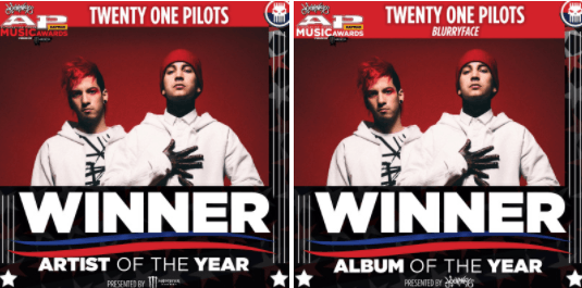 Udało się! Mimo, że z powodu Emotional Roadshow Tyler i Josh nie mogli wziąć udziału we wczorajszej gali rozdania nagród magazynu Alternative Press, i tak rządzili tą imprezą. Chłopaki zdobyli dwie nagrody: w kategorii Artist Of The Year (Artysta Roku) i Album Of The Year (Płyta Roku) za Blurryface.