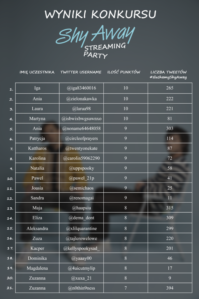 Screeny udostepnień postów, wszystkich tweetów z hashtagiem #sluchamyShyAway & zasubskrybowania naszych mediów społecznościowych (YouTube, Facebook, Twitter, Instagram) zapakuj w .zip i wyślij na adres twentyonepilotspolska@gmail.com po zakończeniu STREAMING PARTY najpóźniej do niedzieli, 11 kwietnia 23:59. Wykonanie każdego z powyższych zadań gwarantuje punkt.